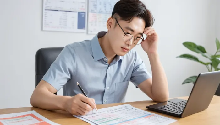 재물운 흐름을 확인하며 저축 계획을 세우는 모습 뱀띠 운세에 따라 금전 흐름을 예측하고 계산기를 활용하는 모습