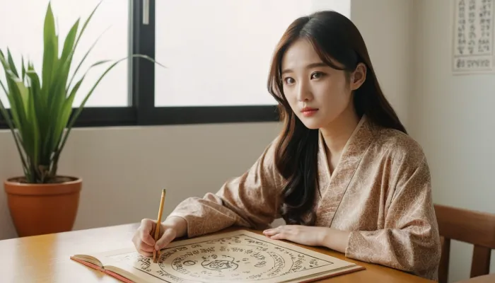 뱀띠 운세를 참고하며 재정 계획을 세우는 모습 다이어리에 금전운 목표를 작성하며 뱀띠 올해 운세를 정리하는 장면