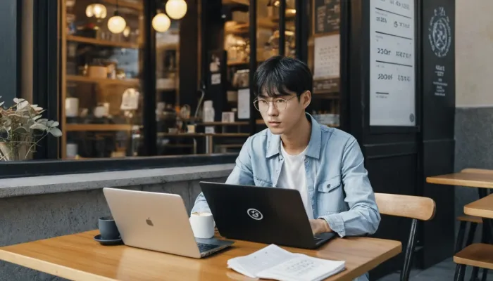 카페에서 노트북으로 재물운을 검색하는 모습뱀띠 운세 정보를 온라인으로 찾아보며 금전 계획을 세우는 모습