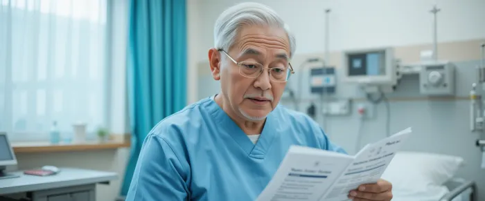 위내시경 금식시간 안내문을 읽는 노년 남성 모습병원에서 받은 문서를 보며 위내시경 금식시간 안내를 숙지하는 노년 남성