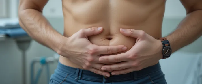 위내시경 금식시간 전에 복통을 느끼는 남성 모습검사 직전 위내시경 금식시간 중 배를 짚고 불편함을 호소하는 남성의 모습
