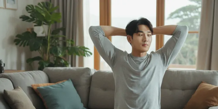 비타민d 2,000iu 복용 후 활력을 되찾은 모습거실에서 기지개를 켜며 상쾌함을 느끼는 장면